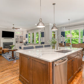 Open concept kitchen with five burner gas stove and abundant counter space